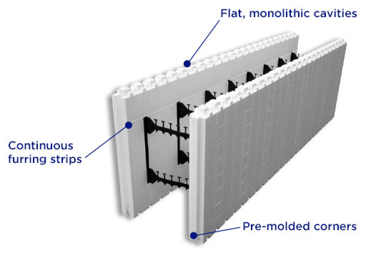 Pre-assembled ICF "Block" forms can be used for single story or multi-story residential or commercial projects. Flat, monolithic cavities will accommodate all rebar requirements. Continuous furring strips, pre-molded corners and exclusive accessories make set-up and bracing quick and simple. High density packaging reduces shipping and handling costs up to 50% (when compared to rigid ICF systems). Full hardware packages are available to build virtually any wall shape.